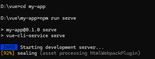 생성이 완료되면 새로 생성된 my-app 폴더로 이동한 다음 vue 애플리케이션을 실행한다.