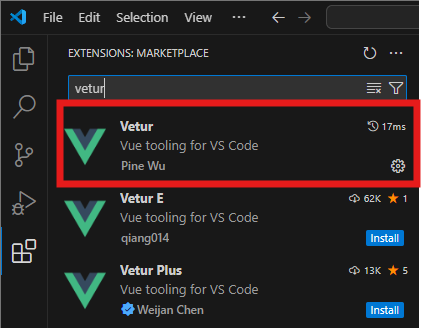VSCode에서 vetur 확장자를 검색하여 설치를 누른다. 위 이미지처럼 톱니바퀴가 나오면 제대로 설치가 완료된거다.